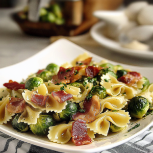 This dish combines pasta, crispy bacon, and roasted Brussels sprouts in a creamy sauce, making it both flavorful and satisfying.