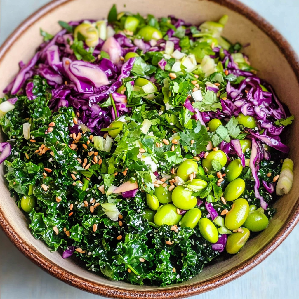 5. In a large mixing bowl, combine chopped kale, cabbage, cooked edamame, scallions, sesame seeds, and peanuts (if using). Drizzle with olive oil or lemon juice.