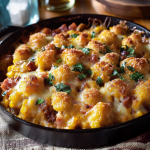 Cowboy casserole with crispy tater tots, creamy beef filling, crispy bacon, and melted cheese — hearty, salty, and ridiculously satisfying.